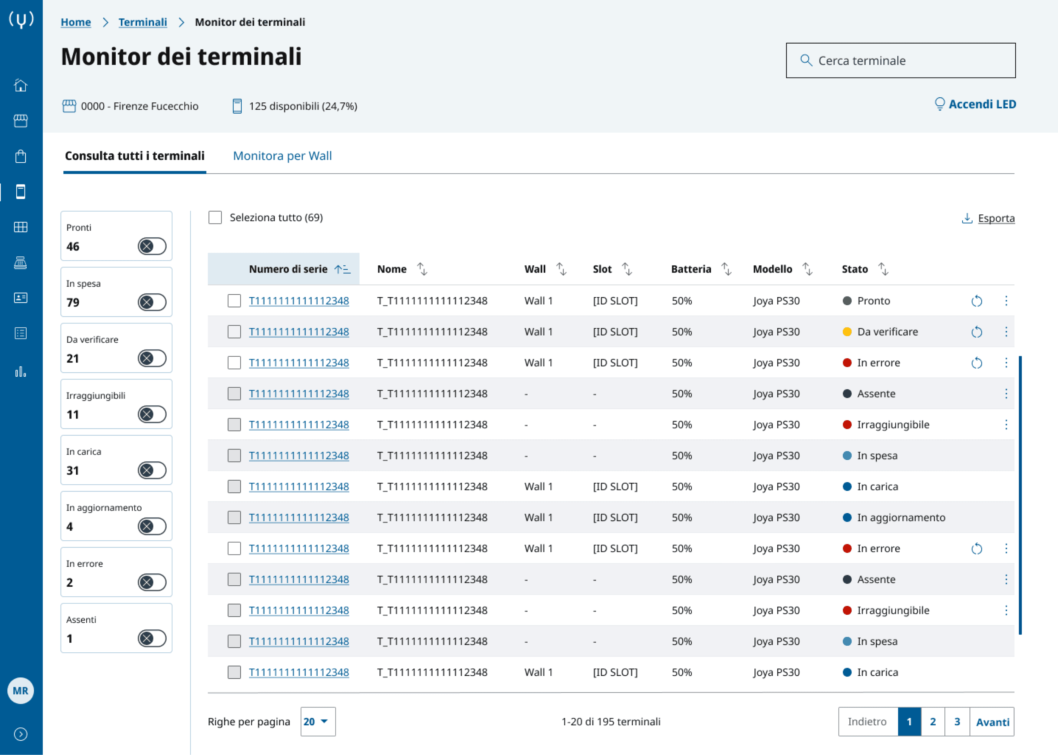 Devices can be monitored using two views: a table view or a wall view. In this section, we se the table view, where users can take a look at all devices in the store. Actions change according to status.