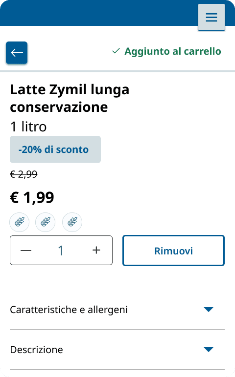Key details, such as allergens or food certifications, are displayed as icons. More detailed information is available at the bottom of the screen.