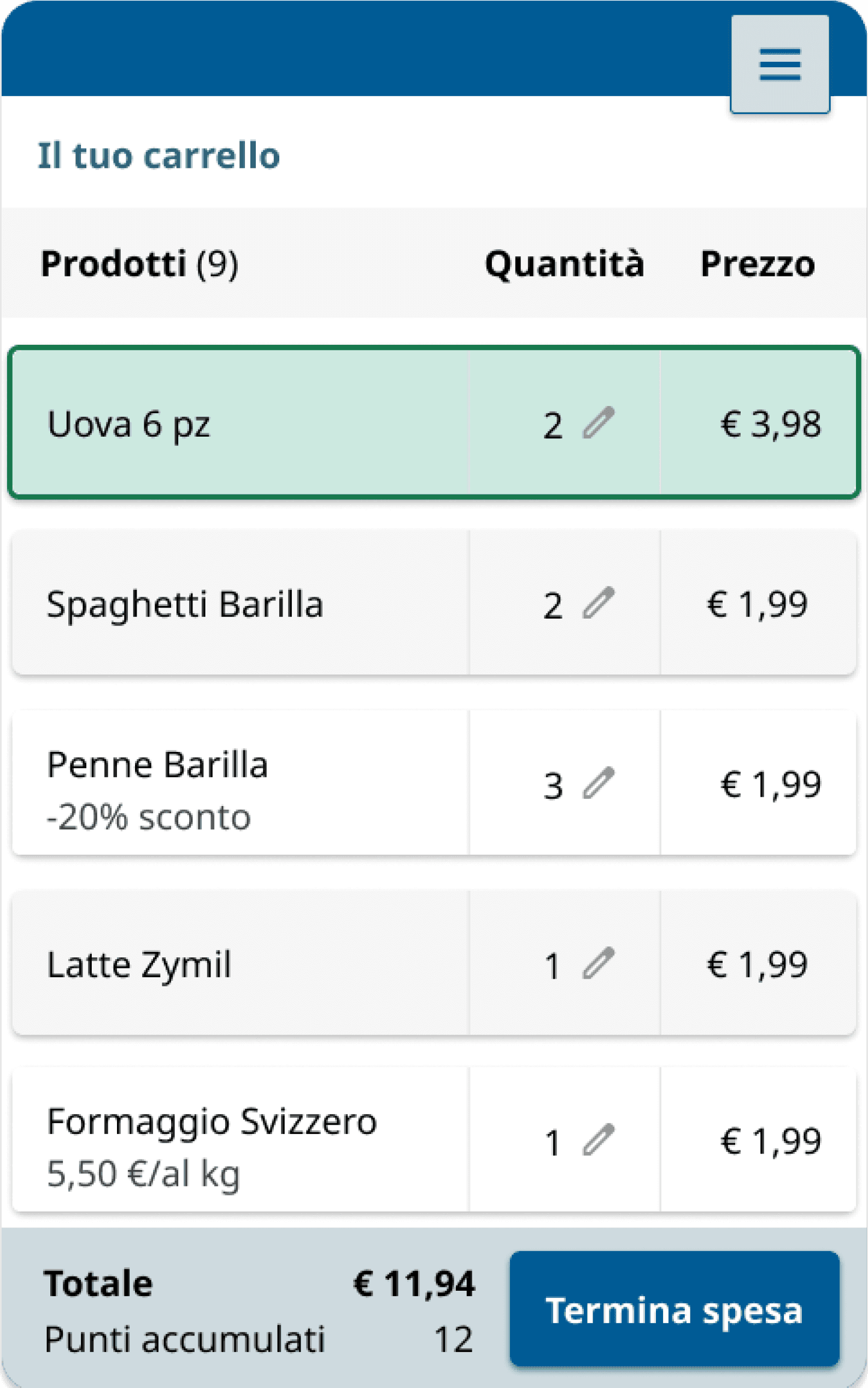 Quantities can be adjusted directly on screen, eliminating the need to scan the same product multiple times. Users can also remove a product by clicking the remove button.